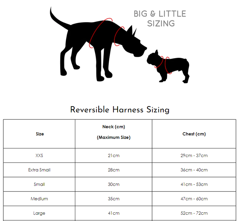 Deze leuke tuigjes van het Australische merk Big and Little Dogs zijn aan 2 kanten te dragen dus je hebt twee tuigjes in één! De comfortabele tuigjes zijn gemaakt van een ademende neopreen stof die snel droog is. De buikband is royaal verstelbaar en op de rug zit een D-ring waaraan de lijn bevestigd kan worden.