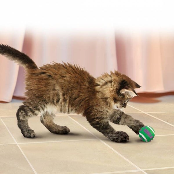 KONG Kat Tennisballen met belletje bevordert gezonde lichaamsbeweging en stimuleert de natuurlijke instincten van uw kat om te achtervolgen, jagen en vangen. Waarom zouden alleen honden plezier mogen maken? KONG Kat Tennis Ballen zijn gemaakt van niet-schurend vilt en zijn onschadelijk voor de tanden bij het spelen. Katten kunnen het inwendige belletje niet weerstaan waardoor binnenkatten gestimuleerd worden om te bewegen.